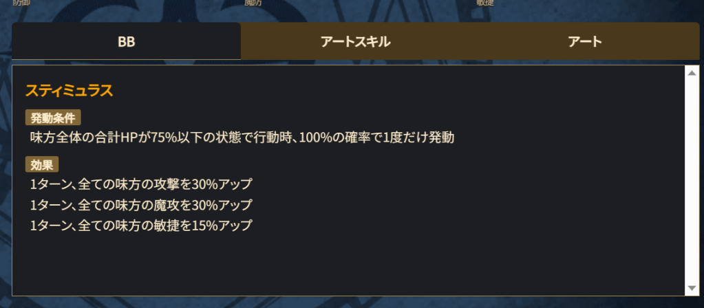 全体攻撃BBの前に発動するとあれ不思議攻撃、魔攻があがります。